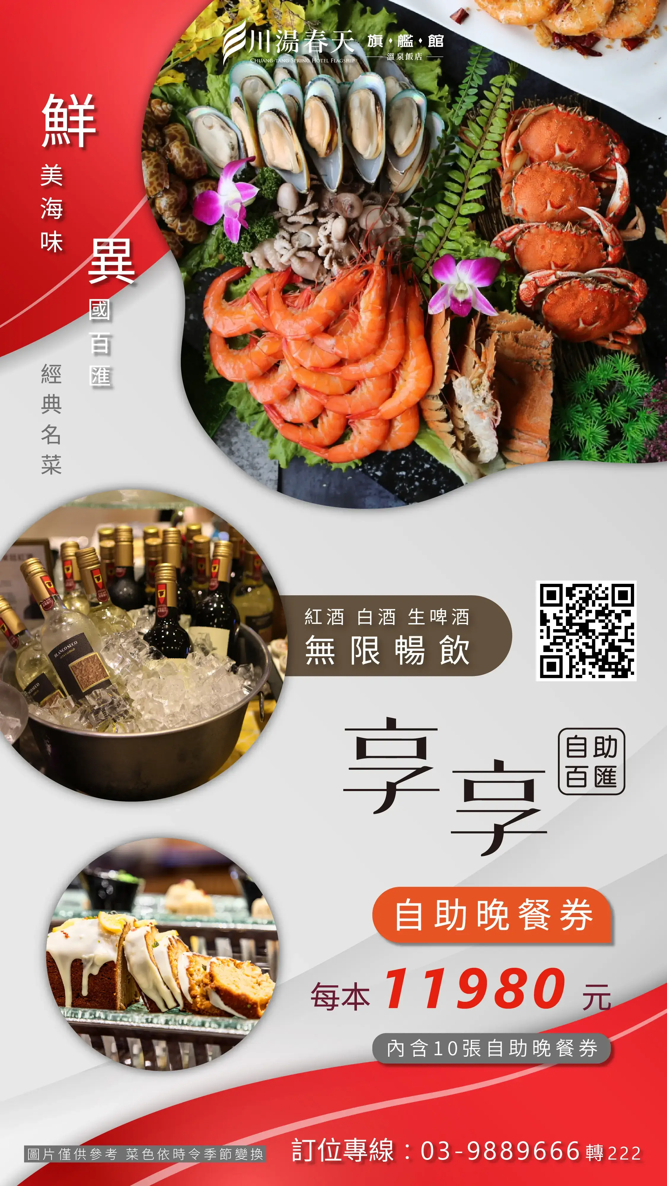 注意事項:1. 本優惠折扣券原定價為NT$1,380元+10%服務費,折扣後優惠價為NT$1,198元整,販售時已開立發票。2. 憑此優惠折扣券可至川湯春天溫泉飯店-旗艦館(2F)享享自助百匯享用晚餐壹客。3. 本優惠折扣券農曆春節期間使用或未於優惠期限(即履約保證日期)內使用完畢,得於享享餐廳折抵餐飲費用NT$1,198元(限壹次折抵完畢)4. 本券係不記名之商品禮券,憑券消費,概不掛失及兌現;若本券因毀損或變形等情事而其重要內容或條碼仍可辨識者,得請求交付商品之內容或折抵餐飲消費,恕不提供補換發;另本券因上述之情事致無法辨識或塗改商品內容者無效。5. 若有任何使用之問題,煩請保留發票以保障權益;若發生退款需求,退款程序需依照本公司之規定辦理之;另該商品禮券之優惠價值款項僅退回原優惠折扣購買人(即原始付款方式)。