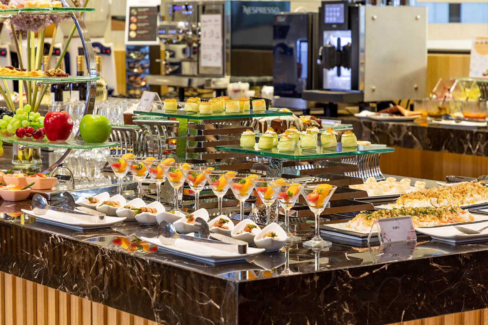 爐烤牛排、鐵板現做、中式熱炒、日式壽司、各式義大利麵、港點、湯品、豐富的冷盤與生菜沙拉區